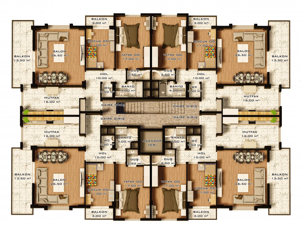 Konutların iç planlamasında ferah ve kullanışlı alanlar ön planda tutulmuştur. Geniş salonlar, fonksiyonel mutfaklar ve doğal ışık alan odalar ile yaşam alanları daha konforlu hale getirilmiştir. Balkon ve ortak kullanım alanları, kullanıcıların sosyal ve bireysel ihtiyaçlarını karşılayacak şekilde tasarlanmıştır.